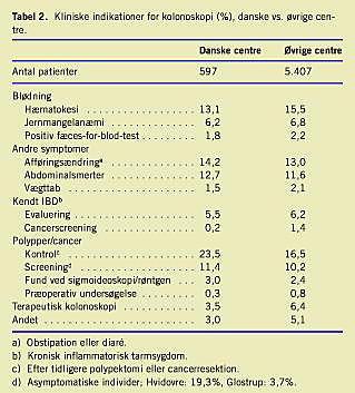 Fordelingen af indikationer fremgår af Tabel 2 . I denne fordeling adskilte de danske afdelinger sig ikke fra de øvrige. De fire hyppigste indikationer (undersøgelse og kontrol for polypper/cancer, hæmatokesi, afføringsændring og abdominal-smerter) udgjorde tilsammen 70-75% af alle undersøgelser. Antallet af asymptomatiske individer, som gennemgik under- søgelse for cancer, var højere på H:S Hvidovre Hospital end andetsteds (pga. landspatientregisterfunktion for arvelig coloncancer).