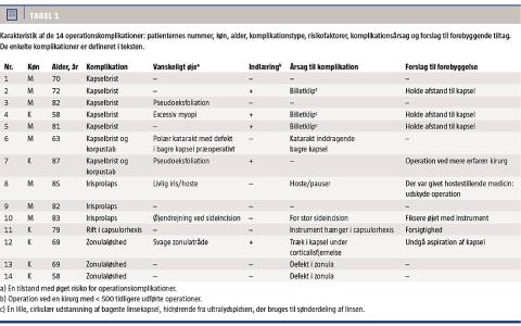 Resultatet af den kliniske høring med en tolkning og årsagsforklaring af komplikationerne er vist i Tabel 1. Der var i alt syv (0,4%) rupturer af den bagerste kapsel. Hos patient nr. 6 var den beskrevne kapselbrist og korpustabet uundgåeligt pga. en præoperativt tilstedeværende defekt i bagerste kapsel. Der var to øjne med løshed af linsens ophængningsapparat fra operationens begyndelse. Tre komplikationer (1, 3 og 9) var uden særligt mønster. To komplikationer (10 og 11) skyldtes mangelfuld kontrol med intraokulært placerede skarpe instrumenter. Den samlede komplikationsfrekvensen var 9/1.440 (0,6%) blandt erfarne kirurger og 5/131 (3,8%) blandt læger under kirurgisk indlæring. I sidstnævnte gruppe kunne komplikation nummer 7 tilskrives en fejlvisitation af en teknisk set meget krævende operation, mens tre komplikationer var såkaldte »billetklip« i den bagerste linsekapsel pga. for megen ultralydenergi for tæt på linsekapslen ved fjernelse af linsekernen. Trods komplikationer opnåede samtlige patienter et bedre syn som følge af operationen.
