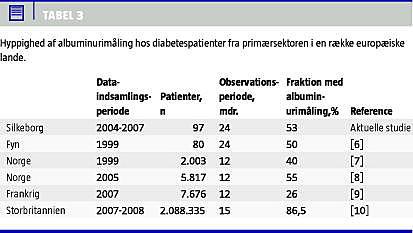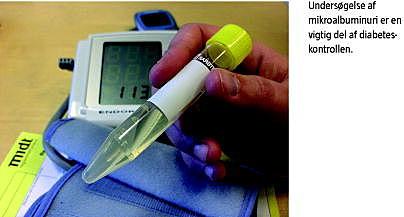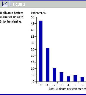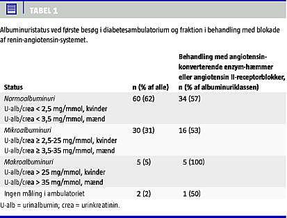 Der blev ikke i undersøgelsen taget hensyn til evt. semikvantitativ albuminurianalyse udført i praksis (f.eks. Micraltest). Det fremgik dog af de skriftlige henvisninger, at kun en læge havde benyttet denne. Vi fastlægger albuminuristatus på baggrund af blot en enkelt bestemmelse, hvilket ikke er optimalt grundet stor dag til dag-variation. Med denne begrænsning blev der påvist 30 patienter med mikroalbuminuri ved første besøg i diabetescenteret, hvoraf de 12 ikke tidligere havde fået målt urinalbumin. Patienter med mikroalbuminuri og mindst en tidligere albuminuribestemmelse var signifikant hyppigere i behandling med RAS-blokade end patienter med mikroalbuminuri uden måling de foregående to år. Der er derfor forhåbning om at øget hyppighed af albuminuribestemmelse vil medføre relevant intervention.