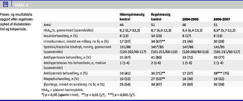 Vi har defineret regelmæssig diabeteskontrol hos egen læge som tilstedeværelse af to eller flere HbA1c -værdier hvert år i de to foregående år før henvisning (n = 51) og ikkeregelmæssig kontrol, såfremt dette krav ikke var opfyldt (n = 46). Regelmæssig diabeteskontrol var karakteriseret ved hyppigere måling af urinalbumin; 67% (KI: 54-80) versus 37% (KI: 23-41), anvendelse af flere antihypertensive præparater, lavere systolisk blodtryk og hyppigere brug af antilipæmisk medicin og magnyl (Tabel 2 ).