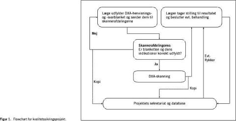 Summary Quality control of the diagnosis of osteoporosis in a Danish county Ugeskr Læger 2004;166:2656-2659 Introduction: The measurement of bone mass density (BMD) is central to the diagnosis and treatment of osteoporosis. As part of a quality development project, we describe referrals to DXA (Dual X-ray Absorptiometry) scanning and the extent to which patients were scanned according to guidelines. Materials and methods: Clinical guidelines were developed by consensus among representatives of all relevant groups in the health care system in the County of Vestsjælland, Denmark. Criteria and standards were agreed. A special form was used for all referrals to the two departments carrying out DXA scans. This allowed for the collection of data at all steps in the process. Data were collected on all referrals between October 1, 2000, and September 30, 2002. Results: Of 1066 referral forms, 79% had a valid indication for scanning. In spite of the remaining 229 referral forms not including a valid indication, 225 of the patients were scanned. Of the referral forms with valid indications, only 59% contained all relevant information from the patient's history. Discussion: The project documented working processes through a complete registration of all referral and scanning procedures and revealed several problem areas that needed improvement. The study's design did not allow conclusions to be made as to whether the guidelines had helped doctors to limit their referrals to patients with a valid indication. The study revealed that the implementation of local guidelines was incomplete, and, among other things, did not lead to all DXA scans having a valid indication. It also pointed the way to improving the various steps of the overall process.
