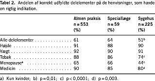 Af de 837 henvisninger med korrekt indikation indeholdt 491 (59%) samtlige ønskelige anamnestiske oplysninger. Praktiserende læger og praktiserende speciallæger var bedre til at udfylde henvisningsblanketterne, end man var på sygehusafdelingerne (Tabel 2 ). Det var især oplysninger om tobaksforbrug og menopausetidspunkt, der manglede.