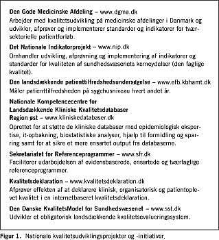 I 1993 fik Danmark som det første land i verden en national strategi for kvalitetsudvikling i sundhedssektoren. Båret frem af stor politisk velvilje medførte strategien at der blev iværksat mange decentrale kvalitetsprojekter, og inden for de senere år også en række store landsdækkende projekter og initiativer (Figur 1 ). Resultaterne og erfaringerne fra disse projekter bliver offentliggjort i disse år.