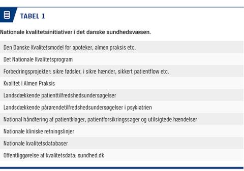 OECD gennemførte i 2013 en evaluering af kvalitetsudvikling i det danske sundhedsvæsen [13] og konkluderede, at Danmark i internationalt perspektiv kunne betragtes som pioner inden for kvalitetsudvikling [13]. OECD anførte, at Danmark var et af de lande, hvor man havde iværksat flest kvalitetsinitiativer, men at der manglede sammenhæng mellem initiativerne. I Tabel 1 gives der eksempler på nationale initiativer, som er målrettet udviklingen af kvaliteten af ydelserne i det danske sundhedsvæsen.