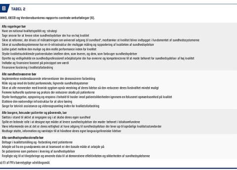 I rapporten påpeges betydelige kvalitetsproblemer i relation til sundhedsvæsenernes ydelser på verdensplan. WHO, OECD og Verdensbanken præsenterer i rapporten 24 anbefalinger, der fremgår af Tabel 2. På baggrund heraf har vi udvalgt nogle områder, hvor der ud fra vores vurdering er behov for at konsolidere kvalitetsudvikling og patientsikkerhed i det danske sundhedsvæsen.