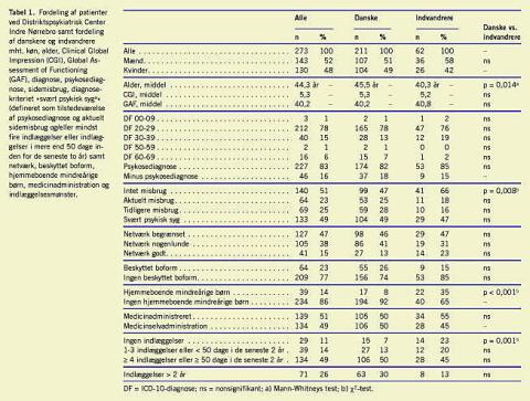 Indvandrere udgjorde 23% af den totale patientgruppe. De var yngre end gruppen af danskere (p = 0,014). Sygdomsgrad og socialfunktion målt ved CGI og GAF var identiske for de to grupper. Der var ingen signifikant forskel i den diagnostiske fordeling. Ej heller i oplysninger om netværk. Der var signifikant flere danskere end indvandrere med misbrugsproblemer.