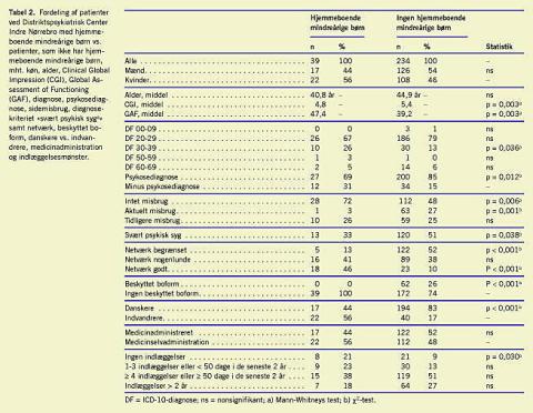 Signifikant flere indvandrere end danskere havde hjemme-boende mindreårige børn (hhv. 35% og 8% p < 0,001). Der var signifikant flere patienter i gruppen af indvandrere med hjemmeboende mindreårige børn, som aldrig havde været indlagt, end i gruppen af danskere på trods af næsten identisk sygdomsgrad og funktionsniveau bedømt med GAF og CGI. Disse patienter fik i højere grad administreret deres medicin via centeret (p = 0,026).