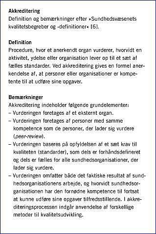 Akkreditering inden for sundhedsvæsenet defineres lidt forskelligt afhængig af den pågældende akkrediteringsorganisation [5]. I Danmark [6] afgrænses akkreditering som anført i boksen.