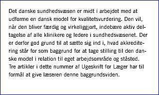 <li>Fugleholm AM, Knudsen JL, Kjærgaard J. Kvalitetsvurdering i Sundhedsvæsenet III. Akkreditering i europæisk perspektiv. Ugeskr Læger 2004;166: 1787-91.</li>