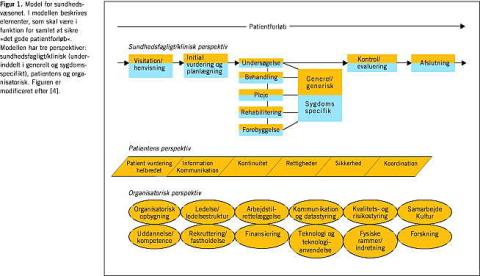 Modellens første perspektiv indeholder elementerne i patientens kliniske forløb. Hvert klinisk element underinddeles i et generelt delelement, der gælder for alle patientforløb, f.eks. at føre journal, og et sygdomsspecifikt delelement, f.eks. den specifikke behandling, pleje og rehabilitering af en patient med apopleksi. Modellens andet perspektiv beskriver elementerne i patientens syn på behandlingen vedrørende opnået helbredsstatus, information, koordination, etc. Modellens tredje perspektiv indeholder de organisatoriske elementer, der er en nødvendig forudsætning for, at patientforløbet kan realiseres: f.eks. finansiering, ledelse, uddannelse, fysiske rammer mv.