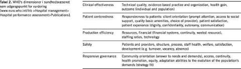 På World Health Organizations europakontor arbejder man med en model for vurdering af hospitaler med de i Tabel 2 anførte prioriterede dimensioner. Det bemærkes, at nøgleelementer i modellen vist i Figur 1 er i god overensstemmelse med den europæiske.