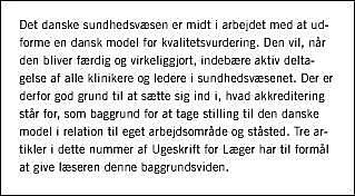 <li>Kjærgaard J, Knudsen JL, Fugleholm AM. Kvalitetsvurdering i Sundhedsvæsenet II. Akkrediteringsprogrammer. Ugeskr Læger 2004;166:1784-7.</li>