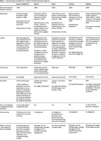 I 2001 nedsatte Det Nationale Råd for kvalitetsudvikling i sundhedsvæsenet en projektgruppe, som fik til opgave at udarbejde en beskrivelse af forskellige tilgange til kvalitetsvurdering i sundhedsvæsenet [5]. Der blev herunder gennemført en spørgeskemaundersøgelse i fire europæiske lande med det formål at synliggøre fordele og ulemper ved forskellige akkrediteringsprogrammer. I undersøgelsen deltog Foundacio Avedian Donabedien (FAD), Spanien (Catalonien); Nederlands Instituut voor Accreditatie van Ziekenhuien (NIAZ), Holland; Agence Nationale d'Accreditation et d'Evaluation en Santé (ANAES), Frankrig og Health Services Accreditation Implementation Steering Group (IHSAB), Irland.