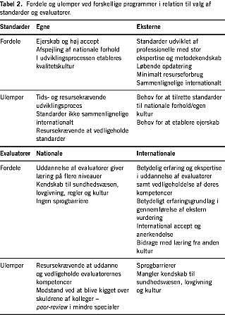 Udvikling af et samlet akkrediteringsprogram tager tid. De programmer, som beskrives i denne artikel, har været under udvikling mellem et år (QIS, som byggede på det tidligere program fra Clinical Standard Board of Scotland) og ti år (ANAES og NIAZ) [4]. Udviklingstiden kan afkortes gennem internationalt samarbejde. Erfaringer fra Spanien (Catalonien) og Irland [5] viser samtidig, at brug af eksterne standarder giver faglig accept i organisationen, ligesom det betragtes som en fordel, at man i organisationen efterfølgende kan sammenligne sig internationalt. Erfaringerne fra de europæiske lande viser, at der er et fagligt incitament i at gennemføre en akkrediteringsproces, særlig når denne relaterer sig til klinisk betydningsfulde processer.