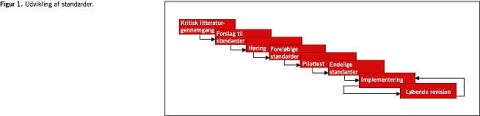 Standarderne er udviklet i overensstemmelse med krav i ALPHA-programmet, der er udviklet af The International Society for Quality in Healthcare (ISQua) [3]. ALPHA udgør en international anerkendt ramme for udvikling af standarder, og i dem stilles der krav om beskrivelse af standardernes fokus, standardtype (struktur-, proces- og resultatstandarder) samt standardformulering, herunder krav om inddragelse af fagpersoner, involvering af interessenter, integration af eksisterende love og aftaler samt inddragelse af gældende evidens. Endvidere beskrives krav til pilottest og løbende revision af standarderne.