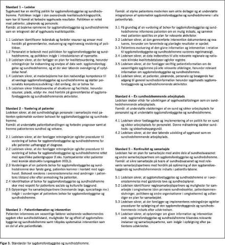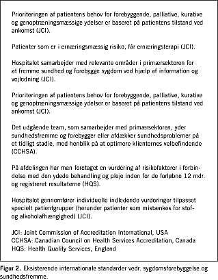 Summary Anne Mette Fugleholm, Lillian Møller & Svend Juul Jørgensen: Quality development in the health care sector. IV: standards for disease prevention and health promotion in hospitals Ugeskr Læger 2004;166:1792-1795 This article describes the development of five core standards for disease prevention and health promotion. The standards are based on the best available evidence and have been developed in accordance with international requirements established by the International Society for Quality in Health Care (ISQau). The standards relate to the patient's pathway and define the responsibilities and activities concerning disease prevention and health promotion as an integral part of all services offered to patients in hospitals. The results of a pilot test in five hospitals are presented. The standards may be incorporated into the future Danish Quality Model.