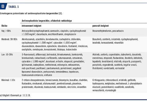Det emetogene potentiale defineres som risikoen for at kaste op i det første døgn efter første indgift af et antineoplastisk lægemiddel uden profylaktisk antiemetika. Antineoplastiske lægemidler klassificeres som højemetogene (> 90% risiko for at kaste op), moderat emetogene (30-90% risiko), lavemetogene (10-30% risiko) og minimalt emetogene (< 10% risiko). Fraset kombinationen af antracyclin og cyclophosphamid (AC), der klassificeres som højemetogen, omfatter risikoklassifikationen kun enkeltstoffer [2] (Tabel 1).
