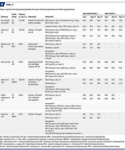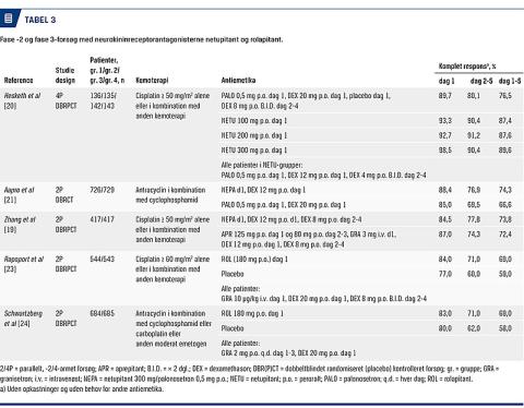 Rolapitant blev godkendt af EMA i 2017 til profylakse af sen CINV ved højemetogen og moderat emetogen kemoterapi. To randomiserede, placebokontrollerede, dobbeltblindede fase 3-forsøg med cisplatin [23] og en undersøgelse med moderat emetogen kemoterapi [24] lå til grund for godkendelsen (Tabel 3). De to forsøg med cisplatin [234] viste, at rolapitant 180 mg dag 1 øgede andelen med komplet respons i senfasen signifikant mere end placebo hos patienter, der fik højemetogen cisplatin ≥ 60 mg/m2 og samtidig fik intravenøst givet granisetron 10 µg/kg dag 1 og dexamethason dag 1-4 (71% versus 60%, p = 0,0001). Rolapitant havde ligeledes statistisk signifikant effekt sammenlignet med placebo hos patienter, der fik AC eller moderat emetogen kemoterapi (carboplatin eller andre) og samtidig fik granisetron 2 mg × 1 dag 1-3 plus dexamethason dag 1 (71% versus 62%, p = 0,0002) [25].