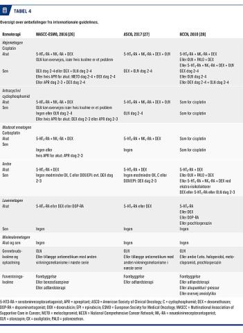 Multinational Association of Supportive Care in Cancer, European Society for Medical Oncology (MASCC/ESMO) [26] og American Society of Clinical Oncology (ASCO) [27] har udarbejdet evidensbaserede guidelines for brug af antiemetika, mens guidelines fra National Comprehensive Cancer Network (NCCN) [28] er baseret på en kombination af evidens og erfaring (Tabel 4). Anbefalingerne tager udgangspunkt i det emetogene potentiale i den antineoplastiske behandling (Tabel 1), hvorimod patientrelaterede risikofaktorer ikke vægtes. Kun kombinationen AC fører til en »opgradering« af den anbefalede profylakse. For alle andre kombinationsbehandlinger planlægges den antiemetiske profylakse i henhold til anbefalingerne for det mest emetogene stof i kombinationen. Anbefalingerne vedrørende oralt givne antineoplastiske lægemidler har lav evidens, og det emetogene potentiale refererer til risikoen for at kaste op i hele forløbet af en behandling – ikke kun risikoen i de første 24 timer. De orale stoffer giver sjældent sen kvalme og opkastning, og antiemetika anbefales således kun på behandlingsdage. Ved langvarig daglig behandling, f.eks. med imatinib anbefales antiemetika kun som p.n. I guidelines er man således enige om, at patienter, der får højemetogen kemoterapi (cisplatin, AC eller andre) anbefales en kombination af en NK1-RA, en 5-HT3-RA og dexamethason. Patienter, der er i moderat emetogen kemoterapi, anbefales en 5-HT3-RA og dexamethason, dog anbefales tillæg af en NK1-RA, når der gives carboplatin ≥ AUC 4. ASCO anbefaler tillæg af olanzapin ved højemetogen kemoterapi, mens MASCC/ESMO og NCCN anbefaler dette som en mulighed. Patienter i lavemetogen kemoterapi kan anvende en 5-HT3-RA, dexamethason eller en DOP-RA. Profylaktisk antiemetika anbefales ikke til patienter med < 10% risiko for opkastning. (Tabel 4).