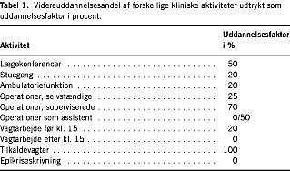I det følgende vil der blive gjort forsøg på at afgrænse den del af det kliniske arbejde, som er videreuddannelse. Der er tale om lige dele kvalificerede skøn, definerede forudsætninger og empirisk erfaring. Hver enkelt del kan selvsagt gøres til genstand for diskussion, men det væsentlige er at etablere en model, hvor man i praksis kan opgøre uddannelsesdelen af det kliniske arbejde. For hver aktivitet er anført en såkaldt »uddannelsesfaktor«, som angiver den andel af den pågældende aktivitet, som hidrører fra det forhold, at der er tale om en videreuddannelsesaktivitet. En oversigt o ver de enkelte elementer er givet i Tabel 1 . De enkelte punkter vil kort blive drøftet i det følgende.