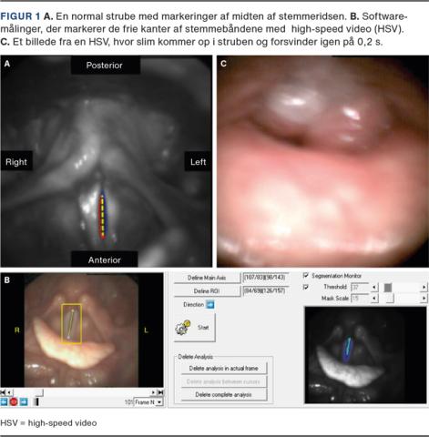 Figur 1 A og B viser en normal strube med manuel markering af området til analyse og midten af stemmeridsen til brug ved HSV til kvantitativ analyse, samt en markering af stemmebåndenes kanter, mhp. kvantitative beregninger. Disse visualiseringer har ikke været tilstrækkelige til f.eks. at forklare og opnå statistiske kendetegn og evidens [20]. Figur 1 C viser et billede fra en HSV (4.000 billeder/s) hos en patient, hvor slim kommer op fra mavesækken og irriterer struben. Dette forekommer på mindre end 0,2 s [21].