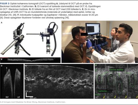 OCT er en nyere skanningsmetode end UL-skanning. Den bruger lys i stedet for lyd, og der kan derfor opnås en langt bedre rumlig opløsning [23-25]. UHR-OCT har en rumlig opløsning på < 5 μm og en dybderækkevidde ned i vævet på 0,4-1 mm. OCT har været anvendt til patienter i narkose, altså uden fonation [8, 9]. Fordelen ved OCT er, at man bedre kan differentialdiagnosticere, hvilke tumorer der skal opereres, og hvilke der skal behandles på anden vis. Det nye er, at man kan analysere væv under fonation med UHR-OCT, således at man undgår alle risici, der er forbundet ved et invasivt indgreb.