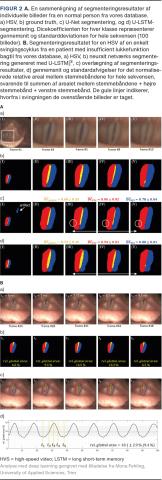 I Figur 2 vises eksempler på den kliniske betydning af deep learning, som er baseret på HSV og analyseret af Mona Fehling. Figur 2A: a) billeder fra en HSV fra en normal person fra vores egen database, b) ground truth er specialisters manuelle segmentering af stemmebåndene og bliver brugt til at måle, hvor præcist et givent neural netværk (deep learning) er til at segmentere, c og d) segmenteringsresultater for to neurale netværk, hvor U-LSTM er mere præcist [11]. Figur 2B: a) HSV og dele af en enkeltcyklus hos en patient med insufficient lukkefunktion bagtil, b) det valgte neurale netværk (U-LSTM) bruges til at estimere venstre og højre stemmebånd, og arealet imellem dem, c) estimeringen af det neurale netværk lægges oven på det originale billede til sammenligning og d) det relative areal mellem stemmebåndene på en kurve givet i tid (ud af 100 billeder pr. analyse).