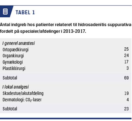 Sideløbende med den medicinske behandling fik hun foretaget adskillige operationer. I perioden 2013-2017 blev hun opereret 69 gange i generel anæstesi. Alle operationerne var udelukkede relateret til HS (Tabel 1). Overvejende blev der foretaget incisioner