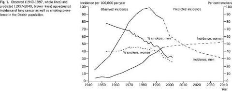 Incidenskurverne kan forlænges med en prognose om, hvordan udviklingen vil være i fremtiden. Prognosen er baseret på den nuværende kræftrate hos folk i 40-50-års-alderen. I den alder er livsstilsfaktorer som rygning og erhverv veletablerede, og kræftrater i den aldersperiode vil blive båret videre til ældre aldersgrupper i fremtiden. Lungekræftraten vil derfor fortsætte med at falde hos mænd, men vil stige hos kvinder, således at de to kurver vil krydses omkring 2010. Endvidere vil en stigende andel af lungekræfttilfældene blive diagnosticeret hos eksrygere.