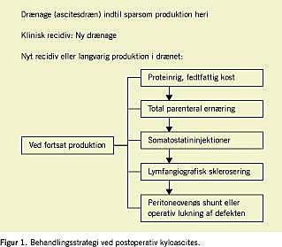 Som vist i denne patienthistorie er førstevalget af behandling, selv ved store mængder kyloascites, altid paracentese, der eventuelt kan gentages i håb om spontan opheling af defekten. Såfremt dette ikke er sufficient kan andre behandlingsmodaliteter komme på tale (Figur 1).