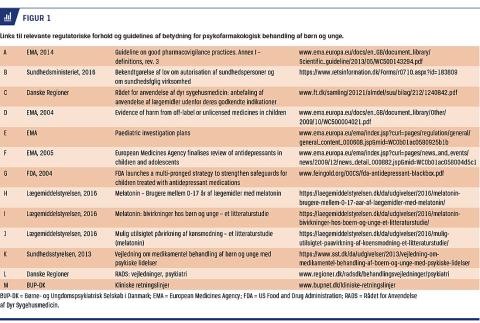 Brug af psykofarmaka til børn og unge, herunder off-label-brug, er et emne, der ikke blot optager børne- og ungdomspsykiatrien, men i høj grad også har myndighedernes, mediernes og patienter/pårørendes be-vågenhed. Ordinationspraksis påvirkes fra flere sider. F.eks. kom der en »black-box warning« fra US Food and Drug Administration (FDA) i 2004 og fra EMA i 2005 (Figur 1F + G), hvor man indikerede en øget risiko for suicidale tanker og adfærd hos børn og unge, der blev behandlet med antidepressiva. Herefter faldt forbru-get af antidepressiva til børn og unge i flere lande (i Danmark først fra 2010). Kombinationen af en periode med stigende forbrug og resultater fra flere metaana-lyser har foranlediget en livlig debat om brugen af