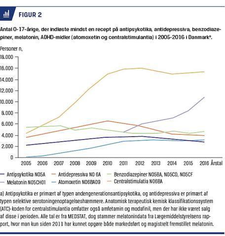fter. Benzodiazepinforbruget var svagt faldende i perioden 2005-2016. Atomoxetinforbruget steg kraftigt fra 2005 (hvor det blev markedsført) til 2012, hvorefter det stabiliseredes. Centralstimulantiaforbruget steg fra 2005 til 2011, hvorefter det stabiliseredes. Melatonin har udvist en stigende forbrugsudvikling fra 2011 til 2016.
