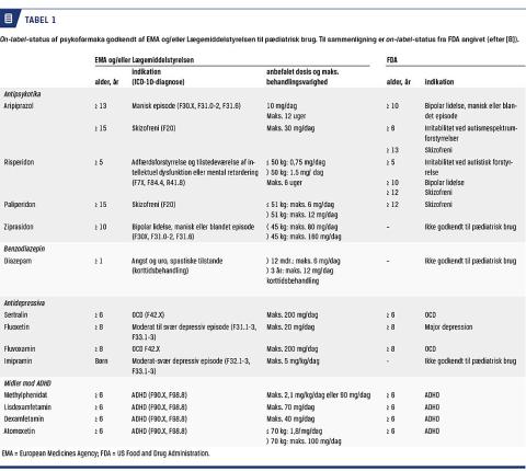P.t. har 13 præparater en godkendt indikation til behandling af psykisk sygdom hos børn og unge i Danmark (Tabel 1) og off-label-forbruget er undersøgt i tre nyere danske studier.