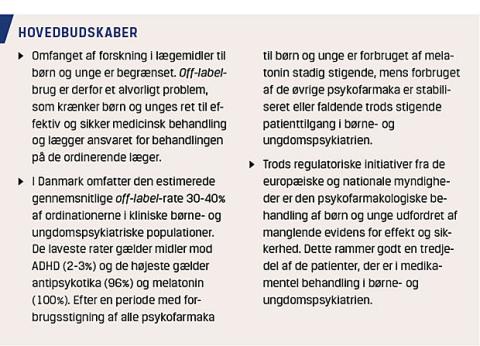 Off-label-studierne viste for det landsdækkende registerstudies vedkommende en gennemsnitlig off-label-rate på 88% for ordination af sedativa, hypnotika og antidepressiva til børn og unge i perioden 2006-2012. Dette stemmer godt overens med tallene fra Region Hovedstadens kliniske studie, hvor man fandt off-label-rater på melatonin på 100%, antidepressiva 51% og benzodiazepiner 73% i 2014. Den lave off-label-rate for midler mod ADHD og de høje off-label-rater for de øvrige psykofarmaka sås i både Region Hovedstaden og Region Midtjylland og hænger naturligt sammen med godkendelsesstatus.