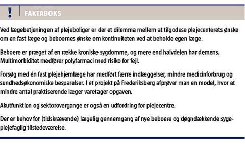 indflytningen skal der laves tidskrævende journalgennemgang, objektiv undersøgelse, diagnoseafstemning samt medicingennemgang med personale og tages kontakt til pårørende. Det forhold, at der ikke kunne skaffes læger til alle stillingerne i projektet, skyldes blandt andet, at arbejdsbyrden umiddelbart blev vurderet til at være for stor [7]. For borgeren og de pårørende er svagheden fjernelsen af det frie lægevalg og tab af kontinuitet. For plejecenteret er samarbejdet sårbart, da der kun er én læge at relatere sig til f.eks. ved sygdom, ferie, manglende kompetencer, eller hvis der opstår samarbejdsproblemer.