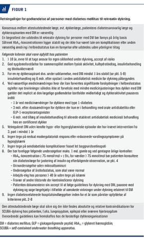 I Danmark foreligger der ingen uddybende vejledning til de læger, der står med ansvaret for udstedelse af de helbredsattester, der bruges ved SCUBA-dykning for dykkeraspiranter med DM. Den internationale dykkerorganisation Divers Alert Network har i samarbejde med Undersea and Hyperbaric Medical Society (UHMS) i USA udgivet retningslinjer for lægelig godkendelse af personer med DM til dykning samt udstrækningen af den dykkeraktivitet, der findes sikkerhedsmæssigt forsvarlig [5]. Flere lande, senest Sverige, har sidenhen fulgt efter med nationale retningslinjer [6]. Selvom disse retningslinjer har mange ligheder, er der p.t. ingen international konsensus om, hvordan læger skal foretage helbredscreening af personer, som har DM og ønsker at dykke. Rekreativ dykning er ikke på samme måde som erhvervsdykning reguleret ved lov.