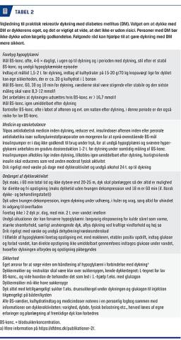 I Figur 1 er beskrevet, hvilke kriterier der skal opfyldes, for at en person med DM kan godkendes til rekreativ SCUBA-dykning. Godkendelsen skal fornys på årlig basis og kan gives af enhver læge i samråd med dykkeraspirantens primære behandlingsansvarlige diabetolog. Den godkendende læge bør udlevere vejledende materiale til patienten om dykkeraktivitetens omfang, fysiske og praktiske forberedelser samt BS-monitorering i forbindelse med dykning. I Tabel 2 er der i summarisk form anført de retningslinjer, som dykkeren bør følge. En mere uddybende forklaring kan hentes via Flyve- og Dykkermedicinsk Selskabs hjemmeside (https://dfdms.dk/publikationer-2/, hvor lister over dykkermedicinsk kyndige læger også findes.