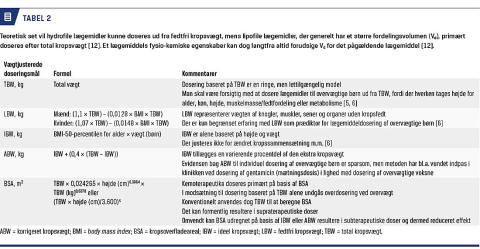 Tabel 2 viser forskellige udregningsmodeller, der er lavet til korrektion af kropsvægt ved dosisskalering i forhold til overvægt og primært er udviklet til voksne.