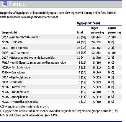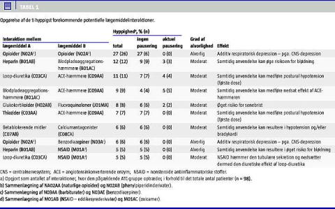 Resultater: Fire patienter blev ekskluderet, da deres medicinske behandling kun omfattede et lægemiddel. I gennemsnit blev 98 patienter behandlet med ti lægemidler pr. patient. I alt blev der fundet 242 PLI, gennemsnitlig 2,5 interaktioner pr. -patient. De lægemidler, som oftest var involveret i PLI, var antitrombotiske midler, opioider, loop-diuretika, angiotensinkonverterende enzym (ACE)-hæmmere, betablokkere, nonsteroide antiinflammatoriske stoffer (NSAID), kortikosteroider, quinoloner, hjerteglykosider, thiazider, anæstetika, antidepressiva, antiepileptika og sedativa.