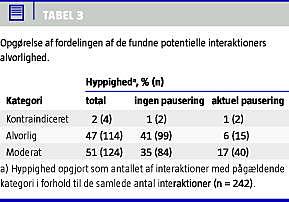 Af de fundne PLI blev 49% karakteriseret som kontraindiceret eller alvorlige og kunne herved - ifølge Micromedex - have potentielt alvorlige konsekvenser for patientens tilstand (Tabel 3). På trods af dette blev hovedparten af de alvorlige PLI vurderet at være uden reel klinisk betydning på ITA, hvilket skyldtes patientmonitorering og pausering af lægemidler samt, at de er almindelige anbefalede kombinationsbehandlinger.