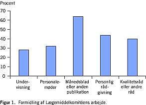 Hovedparten (23 ud af 25) af komitéerne i primærsektoren udgav en rekommandationsliste, som typisk blev opdateret en gang årligt. Komitéerne deltog i kontrollen af lægemiddelforbruget, og de fleste komitéer (21 ud af 25) udsendte forbrugsstatistikker til afdelingerne. Ydermere deltog komitéernes medlemmer i undervisning, personalemøder, personlig rådgivning og kvalitetsråd i varierende omfang (Figur 1 ).