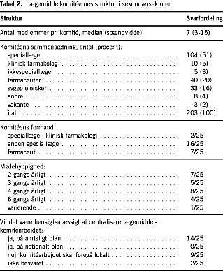 Introduktion: Formålet med undersøgelsen var at beskrive struktur og aktivitet for danske lægemiddelkomitéer i primær- og sekundærsektoren.