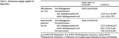 Afdelingernes gennemsnitlige lægemiddeludgifter pr. indlæggelse var 302,72 kr. (95% CI: 209,07-396,37 kr.). Udgifterne hang sammen med patienternes daglige lægemiddeludgifter ved indlæggelsen, indlæggelsesvarigheden og kønnet, men ikke med hospitalet eller alderen (Tabel 4).