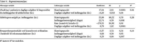 I alt 55% (227/413) og 60% (285/473) af ordinationerne fulgte rekommandationerne, p = 0,13. Andelen af ordinationer, som kunne substitueres generisk, var 31% (126/413) og 28% (134/473), p = 0,20. Herved kunne der opnås en gennemsnitlig besparelse på 8,66 kr. (95% CI: 4,61-12,72 kr.) pr. indlæggelse, svarende til 2,9% af afdelingernes lægemiddeludgifter. Besparelsen ved konsekvent generisk substitution hang sammen med indlæggelsesvarigheden og patienternes lægemiddeludgifter ved indlæggelsen, men ikke med hospitalet, alderen eller kønnet (Tabel 4).
