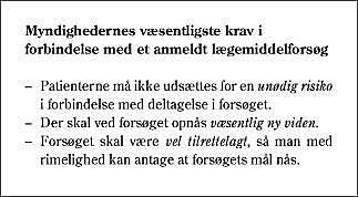 Det egentlige og væsentligste formål med lovgivningen var og er at sikre, at ingen patienter udsættes for unødig risiko i forbindelse med afprøvningen af lægemidler. De bestemmelser, der er gældende i Danmark i dag, bygger i væsentlig grad på et fælles internationalt regelsæt, ICH guidelines (1). Lovgivningen omtaler en række punkter, der skal følges, når man ønsker at udføre lægemiddelforsøg. Nedenfor gennemgås de vigtigste regler, der har relevans for danske læger. Formålet med gennemgangen er at uddybe enkelte punkter for at fremme forståelsen for myndighedsarbejdet. For en mere detaljeret gennemgang henvises til Lægemiddelstyrelsens vejledning (2).