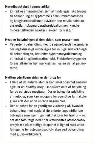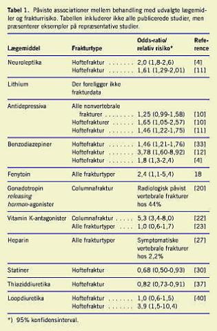 En række farmaka har sidevirkninger, som øger eller nedsætter risikoen for fraktur eller påvirker parathyroideafunktionen. Der bør tages behørigt hensyn til disse forhold, når behandlingen iværksættes, bl.a. ved at informere patienterne og evt. vurdere fraktur- og faldrisikoen. Der er behov for yderligere studier, som kan belyse, hvorvidt behandling med disse lægemidler bør betragtes som egentlige risikofaktorer for fraktur - og om der som følge heraf bør iværksættes osteoporoseprofylakse på et tidligt tidspunkt.