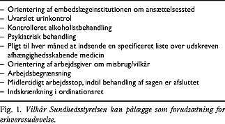 Af Fig. 1 fremgår, hvilke vilkår der kan pålægges for fortsat erhvervsudøvelse. De er ikke tidsbegrænsede, og sundhedspersonen skal selv anmode om at få dem ophævet. Dette kan normalt tidligst ske efter et år. Endelig kan sundhedspersonen fratages sin autorisation eller selv fraskrive sig den.
