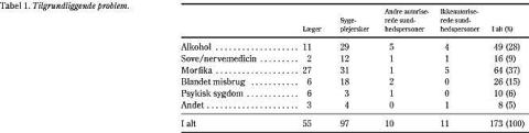 Den primære årsag til, at sagen blev rejst, fremgår af Tabel 1 . For læger var misbrug af morfika den hyppigste årsag (49%), for sygeplejersker var de hyppigste årsager morfikamisbrug (32%) og alkoholmisbrug (30%). I gruppen sove/nervemedicin indgik enkelte tilfælde af misbrug af anæstetika, og i gruppen morfika indgik andre morfikalignende præparater som tramadol og codein. Gruppen »andet« indeholder samarbejdsproblemer, seksuelle krænkelser, medvirken til ægtefælles misbrug, tyveri og demens. I alt havde 84% af lægerne et misbrug, 11% led af psykisk sygdom, og i 5% var årsagen til tilsyn en anden. Blandt sygeplejerskerne havde 93% et misbrug, 3% led af psykisk sygdom, og i 4% var årsagen en anden.