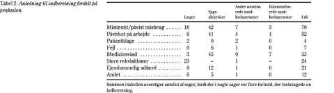 Patientklager rejst over for Sundhedsvæsenets Patientklagenævn eller fejlbehandling i henhold til autorisationslovene var sjældent anle dning til, at sager blev rejst. Dette stemmer overens med, at meget få lægefejl blev registreret af Nimb (5). Af en del af de indberetninger, embedslægerne modtog, fremgik det imidlertid, at mindre fejl og forsømmelighed ofte var medvirkende til indberetningen.