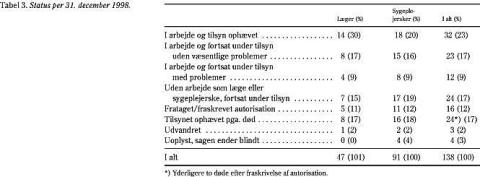 Knap halvdelen (49%) var fortsat i arbejde ved undersøgelsens afslutning. Samlet findes 62 (45%) med god status og 72 (52%) med dårlig. I fire sager var det ikke er muligt at vurdere status. I alt 40% af lægerne og 37% af sygeplejerskerne havde god status. Status set i forhold til alkohol-, medicin- eller blandingsmisbrug viste, at der var lidt flere medicinmisbrugere, der havde god status, end blandt de øvrige (p=0,048).